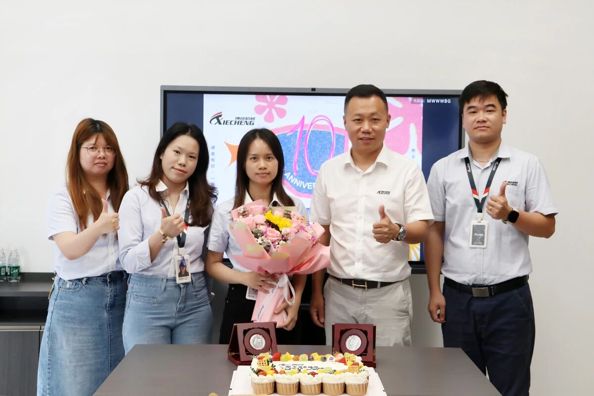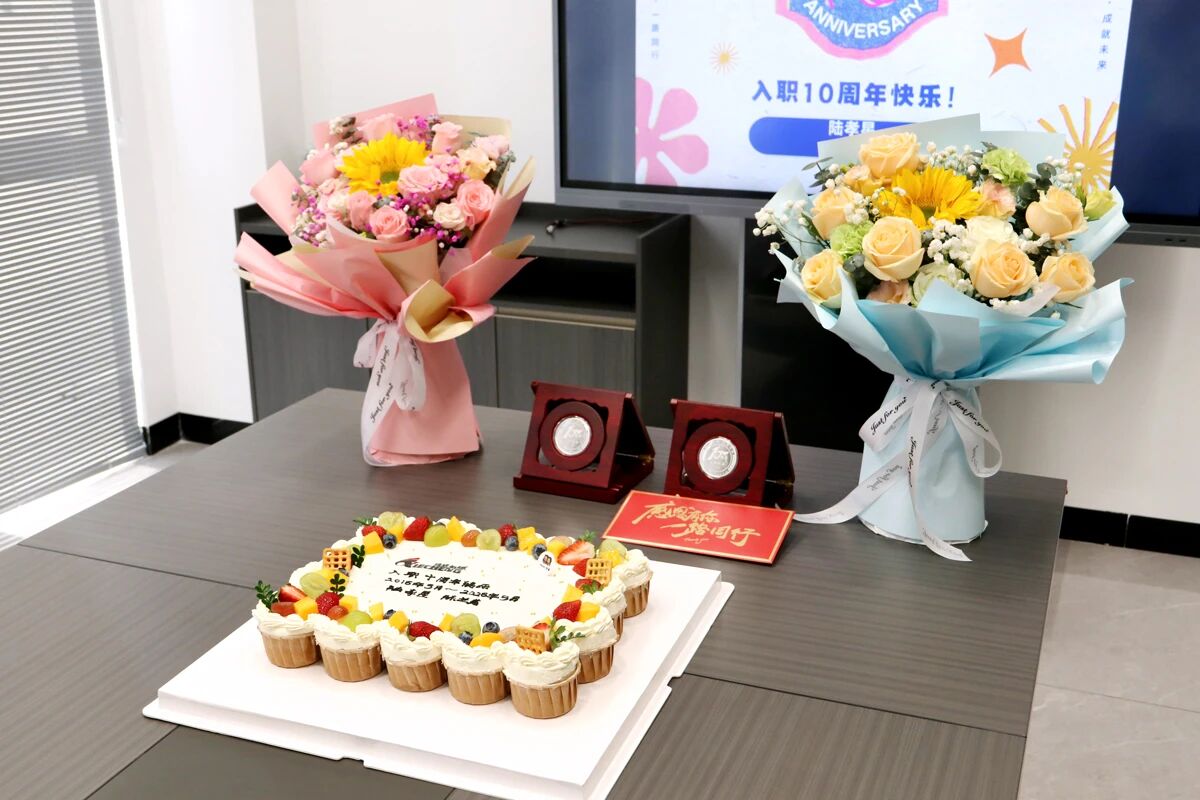 岁月鎏金,十年一秩。2026年3月26日上午,携成为生产制造中心副总经理陆孝星与人事行政部主管陈兰英共同举办入职十周年纪念活动。携成总经理符智波先生,与生产制造中心核心骨干、人事行政部同仁温暖相聚,以最真挚的方式,致敬两位“十年携成人”的坚守与奉献。